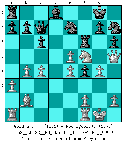Last move : 1-0 2018 September 16 20:1:22 [Event "FICGS__CHESS__NO_ENGINES_TOURNAMENT__000101"] [Site "FICGS"] [Date "2018.08.13"] [Round "1"] [White "Goldmund,Heike"] [Black "Rodriguez,Juan Antonio"] [Result "1-0"] [WhiteElo "1271"] [BlackElo "1575"] 1.b4 e5 2.Bb2 d6 3.e3 Nf6 4.Nf3 Bg4 5.Be2 Be7 6.c4 Nbd7 7.O-O O-O 8.d3 Ne8 9.Nxe5 Bxe2 10.Qxe2 dxe5 11.a3 f5 12.Qf3 c6 13.Nd2 Qc7 14.e4 f4 15.Qg4 Nef6 16.Qh3 Rf7 17.Nf3 h6 18.Nh4 Nf8 19.Nf5 Bd8 20.g3 Ng6 21.g4 Nh7 22.Qh5 Rf6 23.d4 Ne7 24.dxe5 1-0 Polish (Sokolsky) opening Kingside Castling by player White (move 7) Kingside Castling by player Black (move 7) Player White won this chess game. Follow this game move after move (download)Examine moves that smite! A good eye for smites is far more important than a knowledge of strategical principles. (Purdy) Nach Morphy wurde nichts neues mehr in der Behandlung offener Positionen gefunden. (Mikhail Moiseyevich Botvinik) Cuando tu casa esta en llamas, no puedes ser molestado por tus vecinos. O, como decinos en Ajedrez, si tu Rey esta bajo ataque, no te preocupa perder un Peón del lado de la Reina. (Gary Kasparov) A chaque perte on perd un peu de soi. (Joël Lautier) Don't anthropomorphize computers - they hate it. (Anonymous)