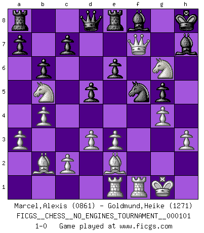 Last move : 1-0 2018 August 27 7:36:31 [Event "FICGS__CHESS__NO_ENGINES_TOURNAMENT__000101"] [Site "FICGS"] [Date "2018.08.13"] [Round "1"] [White "Marcel,Alexis"] [Black "Goldmund,Heike"] [Result "1-0"] [WhiteElo "0861"] [BlackElo "1271"] 1.f4 d5 2.Nf3 Nc6 3.e3 Bg4 4.Be2 Nf6 5.O-O e6 6.b3 Be7 7.Bb2 O-O 8.a3 Re8 9.b4 Bf8 10.Nc3 Ne7 11.h3 Bf5 12.g4 Bg6 13.d3 h6 14.Qe1 Bh7 15.Qf2 b6 16.Rae1 g5 17.Ne5 Qd6 18.Nb5 Qd8 19.fxg5 hxg5 20.Qxf6 Nf5 21.Qxf7+ Kh8 22.Ng6+ 1-0 Bird's Opening Kingside Castling by player White (move 5) Kingside Castling by player Black (move 7) Player White won this chess game. Follow this game move after move (download)By the beauty of his games, the clarity of his play, and the brilliance of his ideas, Fischer made himself an artist of the same stature as Brahms, Rembrandt, and Shakespeare. (David Levy) Ohne Leiden bildet sich kein Charakter. (Ernst Freiherr von Feuchtersleben) Yo tuve un dolor de muelas en la primer partida. En el segundo juego, tuve un dolor de cabeza. En el tercero, tuve un ataque de reumatísmo. En la cuarta partida, no me sentía muy bien. ¿Y en el quinto juego? Bueno, ¿que acaso uno tiene que ganar todos los juegos?. (Siegbert Tarrasch) Il vaut mieux sacrifier les pièces de l'adversaire. (Xavier Tartacover) Think like a man of action, act like a man of thought. (Henri Louis Bergson)