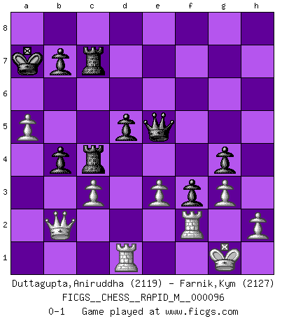 Last move : 0-1 2018 November 28 13:4:3 [Event "FICGS__CHESS__RAPID_M__000096"] [Site "FICGS"] [Date "2018.08.15"] [Round "1"] [White "Duttagupta,Aniruddha"] [Black "Farnik,Kym"] [Result "0-1"] [WhiteElo "2119"] [BlackElo "2127"] 1.d4 Nf6 2.Bg5 d5 3.e3 c5 4.Bxf6 gxf6 5.dxc5 Nc6 6.Nd2 e5 7.Nb3 Bxc5 8.Nxc5 Qa5+ 9.c3 Qxc5 10.Be2 Be6 11.Nf3 Rg8 12.g3 O-O-O 13.O-O h5 14.b4 Qd6 15.Nh4 Kb8 16.Bxh5 Bh3 17.Re1 Qe6 18.Rc1 Ne7 19.Kh1 Ng6 20.Nxg6 fxg6 21.Bf3 g5 22.Kg1 Rh8 23.Bh1 Qe7 24.f4 Qh7 25.Qd2 Bf5 26.fxe5 fxe5 27.Rf1 Bd3 28.Rf6 e4 29.Qf2 Qh3 30.a4 Ka8 31.a5 a6 32.Rf5 Ka7 33.Ra1 Bc4 34.Rd1 Rc8 35.Rc1 Rh5 36.b5 axb5 37.Ra1 Rc7 38.Rf8 Rh8 39.Rf5 R8h7 40.Rf6 Bd3 41.Rc1 b4 42.Qb2 Rc4 43.Rf2 Rhc7 44.Rd1 Qh5 45.Bf3 exf3 46.Rxd3 g4 47.Rd1 Qe5 0-1 Trompowsky attack (Ruth, Opovcensky Opening) Queenside Castling by player Black (move 12) Kingside Castling by player White (move 13) Player Black won this chess game. Follow this game move after move (download)Mistrust is the most necessary characteristic of the Chess player. (Siegbert Tarrasch) Über die Verhaftung Bobby Fischers: Warum es die Bush-Administration für nötig befindet einen 61 Jahre alten Mann zu hetzten, der für niemanden ausser sich selbste eine Gefahr darstellt ist ein Rätsel. (Nigel Short) Los Peones son nacidos libres, y aún así, se encuentran por doquier encadenados. (Rick Kennedy) Dieu déplace le joueur, et celui-ci la pièce. Quel Dieu derrière Dieu commence donc la trame ? Arturo Perez-Reverte (prix de littérature policière 1993). Ah, beer! The cause of, and the solution to, all of life's problems. (Homer Simpson)