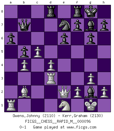 Last move : 0-1 2018 December 12 13:2:0 [Event "FICGS__CHESS__RAPID_M__000096"] [Site "FICGS"] [Date "2018.08.15"] [Round "1"] [White "Owens,Johnny"] [Black "Kerr,Graham"] [Result "0-1"] [WhiteElo "2110"] [BlackElo "2130"] 1.Nf3 Nf6 2.b3 b6 3.Bb2 Bb7 4.e3 c5 5.c4 g6 6.d4 Bg7 7.g3 O-O 8.Bg2 d5 9.Qe2 e6 10.O-O dxc4 11.bxc4 Nbd7 12.Rd1 cxd4 13.exd4 Qc7 14.Na3 a6 15.Nc2 b5 16.c5 Nd5 17.Nce1 Rad8 18.Rac1 Nb8 19.Nd3 Nc6 20.a3 Nde7 21.Nb4 Nxb4 22.axb4 Bc6 23.Ra1 Qb7 24.Rd3 Bd5 25.Ne1 Bxg2 0-1 Reti Opening Kingside Castling by player Black (move 7) Kingside Castling by player White (move 10) Player Black won this chess game. Follow this game move after move (download)Even the laziest King flees wildly in the face of a double check ! (Aaron Nimzowitsch) Woher wissen wir, daß der Neanderthaler Blindschach gespielt hat? -- Bei Ausgrabungen wurden keine Schachbretter und Figuren gefunden. (Anonymous) Durante una competencia de Ajedrez, un Maestro de Ajedrez deberá ser una combinación de presa de caza y un Monge. (Alexander Alekhine) Les Echecs, c'est l'art de la guerre sans les charniers, c'est la résurrection des morts tombés au champ d'honneur, l'espoir perpétuel, la suprématie de l'intelligence sur la force, la culture de l'esprit. (F. Szpiner) The next best thing to gambling and winning is gambling and loosing. (Nick Dandalos)