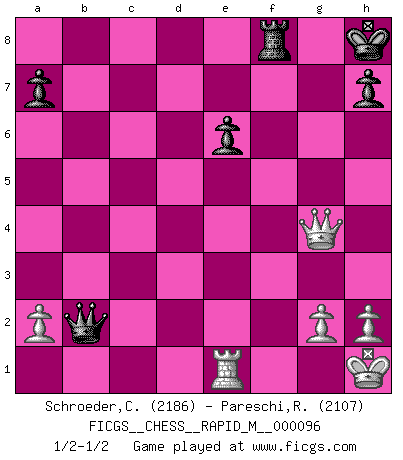 Last move : 1/2-1/2 2018 October 13 15:55:44 [Event "FICGS__CHESS__RAPID_M__000096"] [Site "FICGS"] [Date "2018.08.15"] [Round "1"] [White "Schroeder,Christoph"] [Black "Pareschi,Remo"] [Result "1/2-1/2"] [WhiteElo "2186"] [BlackElo "2107"] 1.e4 e5 2.f4 exf4 3.Nf3 Be7 4.Nc3 Bh4+ 5.Ke2 c6 6.d4 d5 7.Bxf4 Be7 8.Kf2 Nf6 9.Bd3 g5 10.Bxb8 Rxb8 11.exd5 g4 12.Ne5 Qb6 13.Re1 Qxd4+ 14.Kf1 Qf4+ 15.Kg1 Bc5+ 16.Kh1 O-O 17.Ne4 Qxe5 18.Nxc5 Qg5 19.c4 cxd5 20.cxd5 Nxd5 21.Ne4 Qg7 22.Qd2 Bf5 23.Bc4 Nc7 24.Qf4 Bxe4 25.Rxe4 b5 26.Bb3 Ne6 27.Qf2 Rbc8 28.Bxe6 fxe6 29.Qe2 Rc4 30.Rxc4 bxc4 31.Qxc4 Qxb2 32.Qxg4+ Kh8 33.Re1 1/2-1/2 KGA : Cunningham defense Kingside Castling by player Black (move 16) This chess game ended in a draw. Follow this game move after move (download)Chess is 99 percent tactics. (Teichmann) Ich verlor meine Bürgerrechte, mein Gehalt wurde mir nicht mehr bezahlt und ich wurde zensiert und durfte nicht mehr ins Ausland reisen. [nach dem Match Fischer-Taimanov 6:0] (Mark Taimanov) No solamente yo pronostico su triunfo sobre Botvinnik, sino que me adelanto y digo que probablemente Fischer es el jugador de Ajedrez mas grande que haya existido. (John Collins) Je menace de comprendre la position. (Anonyme) There is no instance of a country having benefited from prolonged warfare. (Sun Tzu)