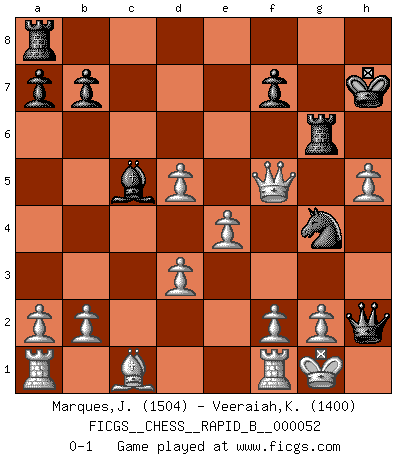 Last move : 0-1 2007 July 5 20:59:36 [Event "FICGS__CHESS__RAPID_B__000052"] [Site "FICGS"] [Date "2007.05.17"] [Round "1"] [White "Marques,Joao"] [Black "Veeraiah,Karuppaiah"] [Result "0-1"] [WhiteElo "1504"] [BlackElo "1400"] 1.e4 c5 2.Nf3 d5 3.d3 d4 4.Nbd2 Nc6 5.Nb3 e5 6.Be2 h6 7.O-O Bg4 8.Nfxd4 Bxe2 9.Nxe2 Nd4 10.Nbxd4 cxd4 11.Qd2 Bd6 12.c3 Nf6 13.cxd4 Qc7 14.d5 O-O 15.Ng3 Rfd8 16.Nf5 Bf8 17.Qe3 g5 18.h4 Bc5 19.Qg3 g4 20.Nxh6+ Kh7 21.Nxg4 Rd6 22.Qxe5 Nxg4 23.Qf5+ Rg6 24.h5 Qh2+ 0-1 Sicilian defense Kingside Castling by player White (move 7) Kingside Castling by player Black (move 14) Player Black won this chess game. Follow this game move after move (download)What would Chess be without silly mistakes ? (Kurt Richter) Es hat in meinem Leben Zeiten gegeben, da ich sehr nahe daran war zu glauben, daß ich auch nicht eine einzige Schachpartie verlieren könnte. (José Raúl Capablanca) Estaba muy claro de que el punto vulnerable del Gran Maestro Americano (Bobby Fischer) radicaba en las posiciones de doble filo, colgantes, irracionales, donde el siempre falló en encontrar un triunfo aún en una posición de clara victoria. (Efim Geller) Le jeu d'échecs est comme rejeté hors du temps. (Antoine de Saint-Exupéry) If you lose the game you should win the analysis! (Proverb)