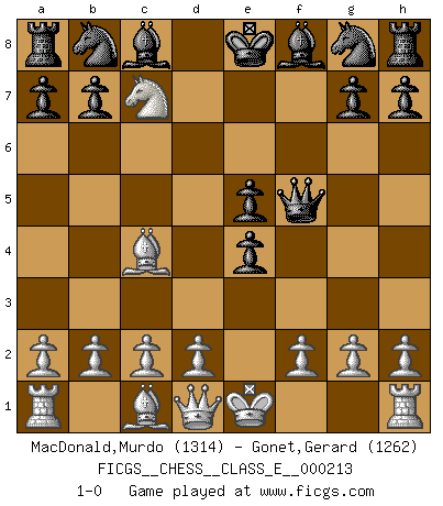 Last move : 1-0 2018 August 22 10:8:29 [Event "FICGS__CHESS__CLASS_E__000213"] [Site "FICGS"] [Date "2018.08.18"] [Round "1"] [White "MacDonald,Murdo"] [Black "Gonet,Gerard"] [Result "1-0"] [WhiteElo "1314"] [BlackElo "1262"] 1.e4 e5 2.Nf3 f5 3.exf5 e4 4.Ne5 Qf6 5.Nc3 d6 6.Bc4 dxe5 7.Nd5 Qxf5 8.Nxc7+ 1-0 Latvian counter-gambit Player White won this chess game. Follow this game move after move (download)Chess is life. (Bobby Fischer) Ein bischen Romantik kann weder im Schach noch in der Liebe schaden. Also versuche ich mich ab und zu daran zu erinnern. (Nigel Short) Botvinnik trataba de restarle el misterio al Ajedrez, siempre relacionandolo a situaciones de la vida ordinaria. El gustaba de llamar al Ajedrez un típico problema inexacto similar a aquellos de los cuales la gente siempre tiene que enfrentarse en la vida cotidiana. (Garry Kasparov) Nous vivons dans un monde échiquéen : chaque jour qui passe est un défi à relever. (Philosophe Sasha) Art disturbs, science reassures. (Georges Braque, Le Jour et la Nuit)