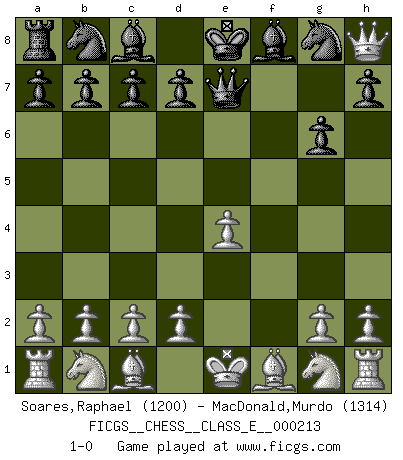 Last move : 1-0 2018 August 25 9:48:5 [Event "FICGS__CHESS__CLASS_E__000213"] [Site "FICGS"] [Date "2018.08.18"] [Round "1"] [White "Soares,Raphael"] [Black "MacDonald,Murdo"] [Result "1-0"] [WhiteElo "1200"] [BlackElo "1314"] 1.e4 e5 2.f4 f6 3.fxe5 fxe5 4.Qh5+ g6 5.Qxe5+ Qe7 6.Qxh8 1-0 King's gambit Player White won this chess game. Follow this game move after move (download)Chess is a sea in which a gnat may drink and an elephant may bathe. (Hindu proverb) Alles was ich jemals tun will ist Schach spielen. (Robert James Fischer) No es tiempo de jugar al Ajedrez cuando la casa esta en llamas. (Proverbio Italiano) L'ordinateur a tué l'originalité. Il n'y a plus guère d'aventures sur l'échiquier. (Jacob Murray) O divine art of subtlety and secrecy! Through you we learn to be invisible, through you inaudible and hence we can hold the enemy's fate in our hands. (Sun Tzu)