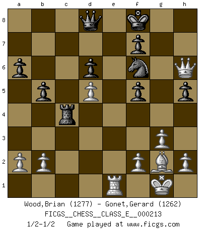 Last move : 1/2-1/2 2018 October 16 10:28:9 [Event "FICGS__CHESS__CLASS_E__000213"] [Site "FICGS"] [Date "2018.08.18"] [Round "1"] [White "Wood,Brian"] [Black "Gonet,Gerard"] [Result "1/2-1/2"] [WhiteElo "1277"] [BlackElo "1262"] 1.Nf3 Nf6 2.g3 g6 3.Bg2 Bg7 4.d3 Nc6 5.O-O O-O 6.e4 d6 7.c3 e5 8.Re1 Be6 9.d4 exd4 10.Nxd4 Nxd4 11.cxd4 c6 12.d5 cxd5 13.exd5 Bf5 14.Nc3 Re8 15.Rxe8+ Nxe8 16.Be3 a6 17.Bd4 Rc8 18.Bxg7 Nxg7 19.Qd4 b5 20.Ne2 Rc4 21.Qe3 h5 22.Nd4 Ne8 23.Nxf5 gxf5 24.Re1 Nf6 25.Qg5+ Kf8 26.Qh6+ 1/2-1/2 Reti : King's Indian attack Kingside Castling by player White (move 5) Kingside Castling by player Black (move 5) This chess game ended in a draw. Follow this game move after move (download)You must take your opponent into a deep dark forest where 2+2=5, and the path leading out is only wide enough for one. (Mikhail Tal) Im Blitz ist es einfacher mit einer Figur weniger anzugreifen, als sich mit einer Mehrfigur zu verteidigen. (Mikhail Nekhemyevich Tal) Mi estilo es algo parecido entre un poco de Tal y Petrosian. (Reshevsky) Les échecs sont un jeu par leur forme, un art par leur essence et une science par sa difficulté d'acquisition. Ils peuvent vous procurer autant de plaisir qu'un bon livre ou une belle musique, mais vous n'aurez une réelle joie que si vous arrivez à bien jouer. (Tigran Petrosian) If we don't succeed, we run the risk of failure. (George W. Bush)