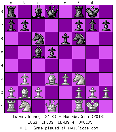 Last move : 0-1 2018 November 11 10:25:38 [Event "FICGS__CHESS__CLASS_A__000193"] [Site "FICGS"] [Date "2018.08.19"] [Round "1"] [White "Owens,Johnny"] [Black "Maceda,Coco"] [Result "0-1"] [WhiteElo "2110"] [BlackElo "2018"] 1.Nf3 Nf6 2.b3 d5 3.Bb2 e6 4.e3 c5 5.d4 Nc6 6.Bd3 Bd6 7.dxc5 Bxc5 8.O-O O-O 0-1 This chess game has been lost on time (started : 2018.08.19 12:36:54) Reti Opening Kingside Castling by player White (move 8) Kingside Castling by player Black (move 8) Player Black won this chess game. Follow this game move after move (download)The combination player thinks forward; he starts from the given position, and tries the forceful moves in his mind. (Emanuel Lasker) Wenn du gegen Bobby spielst, ist es keine Frage von gewinnen oder verlieren. Es ist eine Frage des Überlebens. (Boris Vassilievich Spassky) Yo adoro todas la posiciones. Denme una partida posicional difícil, y la jugaré. Pero posiciones totalmente ganadas, no las tolero. (Hein Donner) La guerre est enfant de la passion, la passion est enfant du narcissisme et le narcissisme est l'enfant. (...) Une autre partie ? (Thibault de Vassal) True nature is revealed in times of difficulty. (Chinese proverb)