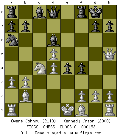 Last move : 0-1 2018 December 26 15:33:10 [Event "FICGS__CHESS__CLASS_A__000193"] [Site "FICGS"] [Date "2018.08.19"] [Round "1"] [White "Owens,Johnny"] [Black "Kennedy,Jason"] [Result "0-1"] [WhiteElo "2110"] [BlackElo "2000"] 1.Nf3 c5 2.b3 d5 3.Bb2 f6 4.e3 e5 5.d4 cxd4 6.exd4 e4 7.Nfd2 f5 8.c4 Nf6 9.Nc3 Bb4 10.Nxd5 Nxd5 11.cxd5 O-O 12.a3 Bd6 13.Nc4 f4 14.Qh5 Na6 0-1 This chess game has been lost on time (started : 2018.08.19 12:36:54) Reti Opening Kingside Castling by player Black (move 11) Player Black won this chess game. Follow this game move after move (download)What is the object of playing a gambit opening?... To acquire a reputation of being a dashing player at the cost of losing a game. (Siegbert Tarrasch) Immer nach dem besten Zug zu suchen ist ziemlich unpraktisch. (Nigel Short) Una mala movida nulifica cuarenta buenas. (Horowitz) Seul un grand joueur sait à quel point il joue faiblement. (Xavier Tartacover) Men never do evil so completely and cheerfully as when they do it from religious conviction. (Blaise Pascal)
