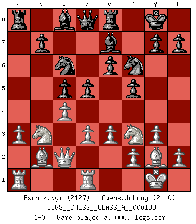 Last move : 1-0 2018 November 26 11:38:50 [Event "FICGS__CHESS__CLASS_A__000193"] [Site "FICGS"] [Date "2018.08.19"] [Round "1"] [White "Farnik,Kym"] [Black "Owens,Johnny"] [Result "1-0"] [WhiteElo "2127"] [BlackElo "2110"] 1.c4 e6 2.Nf3 f5 3.g3 Nf6 4.Bg2 c6 5.O-O Be7 6.b3 d5 7.Bb2 O-O 8.d3 Re8 9.Nbd2 a5 10.a3 c5 11.e3 Nc6 12.Qc2 a4 13.Rfd1 axb3 14.Nxb3 1-0 This chess game has been lost on time (started : 2018.08.19 12:36:54) English Opening Kingside Castling by player White (move 5) Kingside Castling by player Black (move 7) Player White won this chess game. Follow this game move after move (download)Becoming successful at Chess allows you to discover your own personality. That's what I want for the kids I teach. (Saudin Robovic) Wie kann ich Remis annehmen? Ich weiß ja gar nicht, wie ich stehe! (Fritz Sämisch) Cuando veas una buena jugada, trata de encontrar otra mejor. (Emanuel Lasker) Il vaut toujours mieux jouer un plan faux de façon logique que de n'avoir pas de plan du tout. (Victor Kortchnoï) There are 10 types of people in this world: those who understand binary and those who don't. (Anonymous)