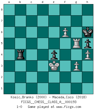 Last move : 1-0 2019 August 18 22:28:51 [Event "FICGS__CHESS__CLASS_A__000193"] [Site "FICGS"] [Date "2018.08.19"] [Round "1"] [White "Kosic,Branko"] [Black "Maceda,Coco"] [Result "1-0"] [WhiteElo "2000"] [BlackElo "2018"] 1.d4 Nf6 2.Bf4 d5 3.e3 c5 4.Nf3 e6 5.c3 Nc6 6.Nbd2 Bd6 7.Bg3 O-O 8.Bd3 b6 9.Qe2 Qc7 10.e4 Bf4 11.Bxf4 Qxf4 12.e5 Nd7 13.g3 Qh6 14.O-O Bb7 15.Rfe1 f6 16.exf6 Rxf6 17.h4 Qh5 18.dxc5 e5 19.cxb6 axb6 20.Nh2 Qe8 21.Ng4 Rf7 22.Bc2 e4 23.f4 Ne7 24.Ne3 h6 25.a3 g6 26.Nb3 Nf5 27.Nxf5 gxf5 28.Nd4 Qe7 29.Kh2 Kh7 30.a4 Nc5 31.Qe3 Qf6 32.Red1 Rg7 33.b4 Rag8 34.Rg1 Ne6 35.Nxe6 Qxe6 36.Bb3 Rc8 37.Qd4 Rgc7 38.Rac1 Rd7 39.Rcd1 R7d8 40.Rg2 Qe7 41.Rc2 Qd6 42.Ra1 Rd7 43.a5 bxa5 44.Rxa5 Qe7 45.Rca2 Qg7 46.Rc5 Rg8 47.Qe3 Qg6 48.Rb5 R8g7 49.Rb6 d4 50.Rxg6 dxe3 51.Rxg7+ Kxg7 52.Kg2 Bc6 53.Kf1 Rd3 54.Ra7+ Kh8 55.Be6 Rxc3 56.Ra5 Kg7 57.Ke2 Rd3 58.Bxf5 Bd5 59.Rc5 h5 60.b5 Kf6 61.b6 Kxf5 62.b7 Rb3 63.Rxd5+ Kg6 64.Rg5+ Kh6 65.f5 Rxb7 66.Kxe3 Rb4 67.f6 1-0 Queen's pawn game Kingside Castling by player Black (move 7) Kingside Castling by player White (move 14) 10 pieces endgame at move 65 : White KRPPP , Black KRPPP WHITE : King + 1 Rook 3 Pawns BLACK : King + 1 Rook 3 Pawns 9 pieces endgame at move 66 : White KRPPP , Black KRPP WHITE : King + 1 Rook 3 Pawns BLACK : King + 1 Rook 2 Pawns Player White won this chess game. Follow this game move after move (download)The tactician must know what to do whenever something needs doing; the strategist must know what to do when nothing needs doing. (Savielly Tartakover) Im Hotelzimmer gab es nur zwei Schaben. (Über die Turnierbedingungen) (Peter Swidler) Una de estas pequeñas movidas modestas pudieran ser mas molestas a tu oponente que la amenaza mas grande. (Siegbert Tarrasch) Ce n'est pas pour s'amuser qu'il joue aux échecs : il célèbre un culte. (Vladimir Nabokov) At work, the authority of a person is inversely proportional to the number of pens that person is carrying. (Dan Rotaru)