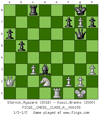 Last move : 1/2-1/2 2019 January 30 19:46:22 [Event "FICGS__CHESS__CLASS_A__000193"] [Site "FICGS"] [Date "2018.08.19"] [Round "1"] [White "Sternik,Ryszard"] [Black "Kosic,Branko"] [Result "1/2-1/2"] [WhiteElo "2018"] [BlackElo "2000"] 1.e4 c5 2.Nf3 Nc6 3.d4 cxd4 4.Nxd4 Nf6 5.Nc3 e5 6.Ndb5 d6 7.Bg5 a6 8.Na3 b5 9.Bxf6 gxf6 10.Nd5 f5 11.Bd3 Be6 12.c3 Bg7 13.Qh5 O-O 14.exf5 Bxd5 15.f6 e4 16.fxg7 Re8 17.Be2 Ne5 18.O-O Qf6 19.Rfd1 Nd3 20.Bxd3 Re5 21.Qh3 exd3 22.Rxd3 Rae8 23.Rf1 Be6 24.Qg3 Re2 25.Qxd6 Rxb2 26.Nb1 Qg6 27.Re1 Rc8 28.Nd2 Bf5 29.Qa3 Rxa2 30.Qxa2 Bxd3 31.h3 1/2-1/2 Sicilian : Pelikan (Lasker/Sveshnikov) variation Kingside Castling by player Black (move 13) Kingside Castling by player White (move 18) This chess game ended in a draw. Follow this game move after move (download)Dazzling combinations are for the many, shifting wood is for the few. (Georg Kieninger) Schach ist das Spiel, das die Verrückten gesund hält. (Albert Einstein) De eso se trata el Ajedrez. Un día le das una lección a tu oponente y al día siguiente el te da una a tí. (Bobby Fischer) Demandez au pauvre Cg1 ce qu'il en pense. Eduard Gufeld à propos de la variante Saemisch de l'Est-Indienne. Chess, like love, like music, has the power to make people happy. (Siegbert Tarrasch)