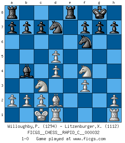 Last move : 1-0 2007 July 7 4:5:35 [Event "FICGS__CHESS__RAPID_C__000032"] [Site "FICGS"] [Date "2007.05.17"] [Round "1"] [White "Willoughby,Peter"] [Black "Litzenburger,Xavier"] [Result "1-0"] [WhiteElo "1294"] [BlackElo "1112"] 1.e4 e5 2.f4 d5 3.exd5 exf4 4.Qf3 Nf6 5.Bb5+ Bd7 6.Nc3 Bd6 7.d4 Qe7+ 8.Qe2 Qxe2+ 9.Ngxe2 f3 10.Bxd7+ Nbxd7 11.gxf3 Bb4 12.Bd2 O-O 13.O-O-O Rfe8 14.Nf4 1-0 This chess game has been lost on time (started : 2007.05.17 20:16:9) KGD : Falkbeer counter-gambit Kingside Castling by player Black (move 12) Queenside Castling by player White (move 13) Player White won this chess game. Follow this game move after move (download)Chess is imagination. (David Bronstein) Ich weiss nicht was Gott gegen mich auf 1.e4 antworten würde. (Robert James Fischer) Puntos débiles o agujeros en la posición de tu oponente deben de ser ocupados por piezas, no Peones. (Siegbert Tarrasch) Avant la finale, les dieux ont créé le milieu de partie. (Tarrasch) A journey of a thousand sites begins with a single click. (Author unknown)