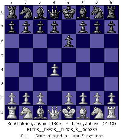 Last move : 0-1 2018 September 30 4:34:32 [Event "FICGS__CHESS__CLASS_B__000283"] [Site "FICGS"] [Date "2018.08.19"] [Round "1"] [White "Roohbakhsh,Javad"] [Black "Owens,Johnny"] [Result "0-1"] [WhiteElo "1800"] [BlackElo "2110"] 1.d4 e6 0-1 This chess game has been lost on time (started : 2018.08.19 15:44:6) Queen's pawn Player Black won this chess game. Follow this game move after move (download)It is difficult to play against Einstein's theory --on his first loss to Fischer. (Mikhail Tal) Garry Kasparov war erst in der Großmeister-Organisation GMA, dann in der Profischach-Vereinigung PCA, zum Schluss kehrte er wieder in den Schoß der FIDE zurück. Aber gut, manche Leute sind flexibel (Viswanathan Anand) De todos mis libros Rusos, la defensa contiene y difunde el 'calor' mas grande que pudiese verse extraño al observar lo supremamente abstracto que el Ajedrez supuestamente es. (Vladimir Nabokov) Les Echecs ne sont pas pour les âmes timides. Ils requièrent un homme entier, qui ne s'arrête pas aveuglément à ce qui a été déjà établi, mais qui tente individuellement de sonder les profondeurs du jeu. (W. Steinitz) If you are good, you will be assigned all the work. If you are really good, you will get out of it. (Dan Rotaru)