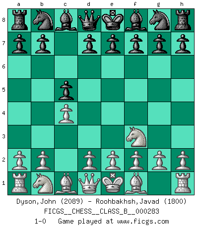 Last move : 1-0 2018 September 29 4:36:5 [Event "FICGS__CHESS__CLASS_B__000283"] [Site "FICGS"] [Date "2018.08.19"] [Round "1"] [White "Dyson,John"] [Black "Roohbakhsh,Javad"] [Result "1-0"] [WhiteElo "2089"] [BlackElo "1800"] 1.Nf3 c5 2.c4 1-0 This chess game has been lost on time (started : 2018.08.19 15:44:6) Reti Opening Player White won this chess game. Follow this game move after move (download)Of Chess it has been said that life is not long enough for it, but that is the fault of life, not Chess. (William Ewart Napier) Ich verachte die Medien. (Robert James Fischer) En manos de Fischer's, una diminuta ventaja teórica es tan buena como tener una Reina de ventaja. (Isaac Kashdan) Comme les marins qui ont mille raisons différentes d'aller en mer, les joueurs d'échecs en ont tout autant avant de s'installer devant une table et jouer... (Vincent Bertignac, philosophe) Art is not a thing, it is a way. (Elbert Hubbard)