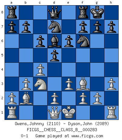 Last move : 0-1 2018 October 18 17:31:49 [Event "FICGS__CHESS__CLASS_B__000283"] [Site "FICGS"] [Date "2018.08.19"] [Round "1"] [White "Owens,Johnny"] [Black "Dyson,John"] [Result "0-1"] [WhiteElo "2110"] [BlackElo "2089"] 1.Nf3 d5 2.b3 Bg4 3.Bb2 e6 4.e3 Nd7 5.Be2 Ngf6 6.c4 Bd6 7.h3 Bxf3 8.Bxf3 c6 9.Nc3 O-O 0-1 Reti : Nimzovich-Larsen attack Kingside Castling by player Black (move 9) Player Black won this chess game. Follow this game move after move (download)Fischer is under obligation to nobody. (Joseph Platz) Im Hotelzimmer gab es nur zwei Schaben. (Über die Turnierbedingungen) (Peter Swidler) Entre mas años cumplo, mas valoro los Peones. (Keres) RxDa4 pat (...) There is far too much law for those who can afford it and far too little for those who cannot. (Derek Bok)