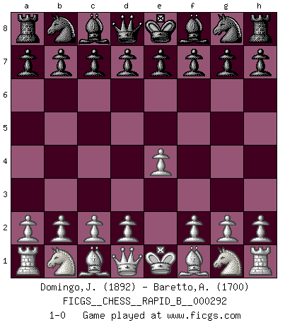 Last move : 1-0 2018 September 20 1:51:34 [Event "FICGS__CHESS__RAPID_B__000292"] [Site "FICGS"] [Date "2018.08.20"] [Round "1"] [White "Domingo,Jordi"] [Black "Baretto,Airah Kristalyn"] [Result "1-0"] [WhiteElo "1892"] [BlackElo "1700"] 1.e4 1-0 This chess game has been lost on time (started : 2018.08.20 17:53:29) King's pawn Opening Player White won this chess game. Follow this game move after move (download)Place the contents of the Chess box in a hat, shake them up vigorously, pour them on the board from a height of two feet, and you get the style of Steinitz. (H. E. Bird) Habe Mut, dich deines eigenen Verstandes zu bedienen. (Immanuel Kant) Antes de los Finales, los dioses han colocado el Juego Medio. (Siegbert Tarrasch) On entre au jeu d'Echecs comme on entre en Religion. Pour le joueur d'Echecs, la partie d'Echecs c'est l'office, la messe, le défilé du 1er Mai, le dépôt de gerbe au Monument aux Morts. C'est un drame sacré. (Michel Roos) Computer Science is no more about computers than astronomy is about telescopes. (Edsger W. Dijkstra)