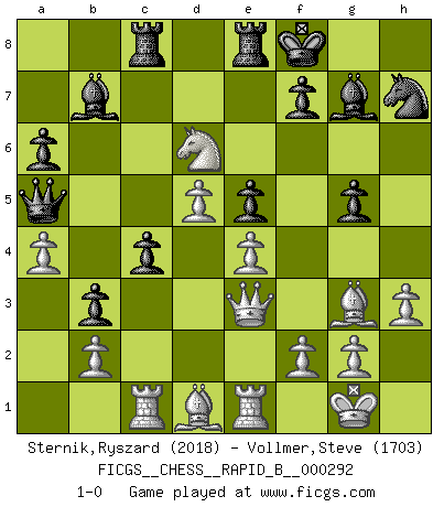 Last move : 1-0 2018 September 20 23:40:50 [Event "FICGS__CHESS__RAPID_B__000292"] [Site "FICGS"] [Date "2018.08.20"] [Round "1"] [White "Sternik,Ryszard"] [Black "Vollmer,Steve"] [Result "1-0"] [WhiteElo "2018"] [BlackElo "1703"] 1.e4 e5 2.Nf3 Nc6 3.Bb5 a6 4.Ba4 Nf6 5.O-O d6 6.c3 b5 7.Bc2 Be7 8.h3 O-O 9.d4 exd4 10.cxd4 Bb7 11.Nc3 Re8 12.Re1 Bf8 13.Bg5 h6 14.Bh4 g5 15.Bg3 Bg7 16.d5 Ne5 17.Nxe5 dxe5 18.Qf3 c5 19.a4 b4 20.Nd1 c4 21.Rc1 Qa5 22.Ne3 Rac8 23.Nf5 Rcd8 24.Nxh6+ Kf8 25.Nf5 b3 26.Qe3 Nh7 27.Bd1 Rc8 28.Nd6 1-0 Ruy Lopez : Steinitz defense deferred (Russian defense) Kingside Castling by player White (move 5) Kingside Castling by player Black (move 8) Player White won this chess game. Follow this game move after move (download)The hardest game to win is a won game. (Emanuel Lasker) Aljechin war kein Nazi. Er war ein Opportunist. Ein schrecklicher Mann. Er liebte Geld über alles und würde für Geld ein Jude, ein Katolik oder ein Protestant werden. (Miguel Najdorf) Preferería tener un Peón que un dedo. (Reuben Fine) Comme les marins qui ont mille raisons différentes d'aller en mer, les joueurs d'échecs en ont tout autant avant de s'installer devant une table et jouer... (Vincent Bertignac, philosophe) Don't be discouraged. It's often the last key in the bunch that opens the lock. (Author unknown)