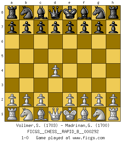 Last move : 1-0 2018 September 20 1:51:34 [Event "FICGS__CHESS__RAPID_B__000292"] [Site "FICGS"] [Date "2018.08.20"] [Round "1"] [White "Vollmer,Steve"] [Black "Madrinan,Gin Karen"] [Result "1-0"] [WhiteElo "1703"] [BlackElo "1700"] 1.d4 1-0 This chess game has been lost on time (started : 2018.08.20 17:53:29) Queen's pawn Player White won this chess game. Follow this game move after move (download)Those who say they understand Chess, understand nothing. (Robert Hubner) Ich habe Kasparov in Rente geschickt. (Veselin Topalov) Entre mas años cumplo, mas valoro los Peones. (Keres) Roi des jeux et jeu des rois, les échecs portent en eux un sentiment d'infini. Ils donnent à celui qui s'est efforcé d'en approfondir les arcanes l'impression de n'être pas à la mesure de l'homme; en fait, ils constituent un résumé de l'univers, un microcosme, et figurent cette grande échelle qui, dans les plans de la lumière descend jusqu'à la matière, qui des abîmes insondables remonte jusqu'en l'infini de Dieu. (Pyrame) You must have a dream in order to have it come true. (A.P.J. Kalam)