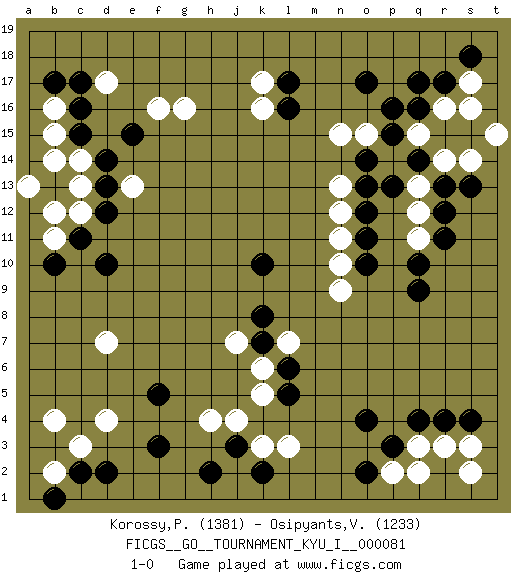 Last move : 1-0 2018 November 10 12:27:8 [Event "FICGS__GO__TOURNAMENT_KYU_I__000081 "] [Site "FICGS"] [Date "2018.08.20"] [Round "1"] [Black "Korossy,Peter "] [White "Osipyants,Vladimir "] [Result "1-0"] [Rating 1 "1381"] [Rating 2 "1233"] 1.q16 d4 2.q4 d17 3.c15 f16 4.b17 k16 5.f3 h4 6.d2 c3 7.c2 b2 8.b1 b4 9.f5 d7 10.h2 k3 11.j3 j4 12.k2 l3 13.q9 r14 14.r12 p14 15.o17 c13 16.c11 e13 17.b13 b14 18.d13 c14 19.d14 c12 20.d12 b11 21.b10 b12 22.d10 b15 23.c16 b16 24.c17 a13 25.e15 g16 26.l17 k17 27.l16 s16 28.r17 s17 29.s18 r16 30.q17 q15 31.s13 s14 32.r13 q13 33.p15 o15 34.p16 q12 35.r11 q11 36.q10 r3 37.r4 q3 38.p3 p2 39.o2 q2 40.o4 s2 41.s4 s3 42.k10 l7 43.l5 k5 44.l6 k6 45.k7 j7 46.k8 n9 47.o10 n10 48.o11 n11 49.o12 n12 50.o13 n13 51.o14 n15 52.p13 t15 53.q14 1-0 Here are the names of the openings (joseki) played in the four corners : Corner d16 : d17 c15Komoku (Somok, Xiao~mu`) 3-4 Point. The komoku (3-4) point is the traditional corner enclosure move..Ikken Kakari (Hankan Keolch'im, Yi Gua`jiao~, 1-Space Low Pincer). The small knight move is the basic approach move to the 3-4 point stone. It has been continually used for over four centuries. There are limitless variations, with new moves constantly being discovered. Black 2 opens the door to a treaure store of joseki. Corner d4 : d4 f3Hoshi (Hwajeom, Seongjeom, Xingwei`) 4-4 Point. The star or hoshi (4-4) point, emphasizing influence at the potential expense of territory.Ikken Kakari (Hankan Keolch'im, Yi Gua`jiao~, 1-Space Low Approach). Black 2 is the standard approach move to the 4-4. Corner q4 : q4 l3Hoshi (Hwajeom, Seongjeom, Xingwei`) 4-4 Point. The star or hoshi (4-4) point, emphasizing influence at the potential expense of territory. Corner q16 : q16 r14Hoshi (Hwajeom, Seongjeom, Xingwei`) 4-4 Point. The star or hoshi (4-4) point, emphasizing influence at the potential expense of territory.Ikken Kakari (Hankan Keolch'im, Yi Gua`jiao~, 1-Space Low Approach). White 2 is the standard approach move to the 4-4. Player Black won this Go (weiqi, baduk) game.Follow this game move after move (download ) One point in the center is worth ten in the corner. (Anonymous) Good luck. You're gonna need it. (Han Solo in Star Wars ep.6)