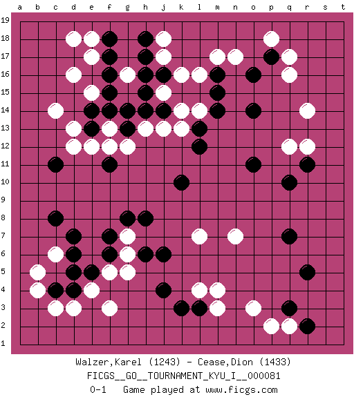 Last move : 0-1 2018 November 11 15:30:48 [Event "FICGS__GO__TOURNAMENT_KYU_I__000081"] [Site "FICGS"] [Date "2018.08.20"] [Round "1"] [Black "Walzer,Karel"] [White "Cease,Dion"] [Result "0-1"] [Rating 1 "1243"] [Rating 2 "1433"] 1.d4 q16 2.q3 d16 3.r5 c6 4.c8 f3 5.e5 c3 6.c4 d3 7.d7 c14 8.f16 r14 9.o16 m17 10.p17 q17 11.m16 l16 12.m15 n17 13.o14 p18 14.q10 m4 15.j4 f5 16.h6 e4 17.d6 b4 18.c11 o3 19.l3 m3 20.j16 l4 21.k3 l7 22.f6 g5 23.j6 n7 24.q7 d18 25.k10 g6 26.h8 q2 27.r2 p2 28.e13 g7 29.g8 k16 30.j14 j17 31.h16 k14 32.l13 k13 33.l12 l14 34.m14 r12 35.r11 q12 36.f7 b5 37.d5 j13 38.h14 h13 39.g13 g12 40.f11 f13 41.g14 f12 42.f14 e12 43.h17 j18 44.f18 d13 45.e14 d12 46.h18 e17 47.f17 e18 48.o11 e15 49.f15 j15 50.h15 g16 0-1 Here are the names of the openings (joseki) played in the four corners : Corner d4 : d4 c6 Hoshi (Hwajeom, Seongjeom, Xingwei`) 4-4 Point. The star or hoshi (4-4) point, emphasizing influence at the potential expense of territory. Ikken Kakari (Hankan Keolch'im, Yi Gua`jiao~, 1-Space Low Approach). White 2 is the standard approach move to the 4-4. Player White won this Go (weiqi, baduk) game. Follow this game move after move (download)Keep away from thickness. (Anonymous) The faster the computer, the slower the brain. (Thibault de Vassal)