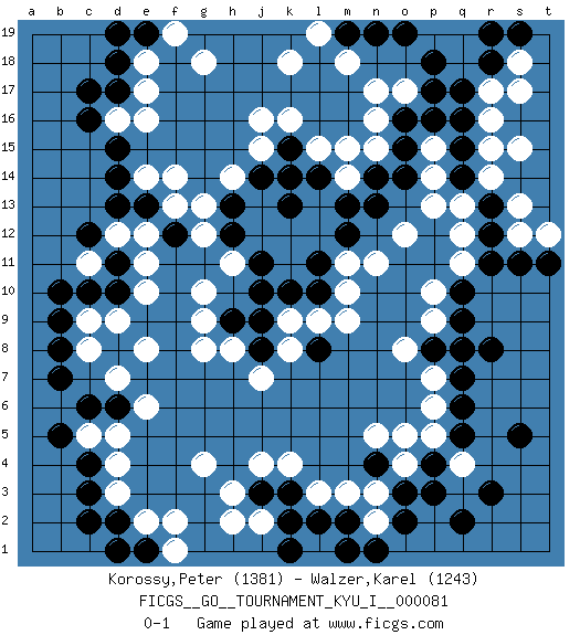 Last move : 0-1 2019 February 10 22:5:35 [Event "FICGS__GO__TOURNAMENT_KYU_I__000081"] [Site "FICGS"] [Date "2018.08.20"] [Round "1"] [Black "Korossy,Peter"] [White "Walzer,Karel"] [Result "0-1"] [Rating 1 "1381"] [Rating 2 "1243"] 1.q16 d4 2.c16 q4 3.o3 m3 4.q2 o4 5.r3 e16 6.d14 e14 7.d13 j16 8.q10 o17 9.o16 n17 10.p17 n16 11.o15 g4 12.c6 c8 13.c10 e8 14.d8 d7 15.b8 d9 16.b7 q8 17.s5 q12 18.r11 o12 19.q6 p10 20.q9 p9 21.r8 p7 22.q7 p6 23.k10 k8 24.k13 l15 25.f12 g10 26.c3 d3 27.c4 d5 28.h12 h14 29.l8 l9 30.j8 k9 31.j9 j7 32.l10 m9 33.k3 k4 34.m2 l3 35.l2 j4 36.j3 h3 37.r13 n3 38.o2 n2 39.n1 h8 40.h9 g8 41.d17 e17 42.m12 r17 43.p18 s15 44.s19 s18 45.r19 s13 46.r12 s12 47.s11 r14 48.q14 r16 49.n13 n11 50.m19 m18 51.n19 k18 52.n4 n5 53.p4 o5 54.p3 q13 55.q15 r15 56.d18 e18 57.e19 f19 58.d19 g18 59.k15 k16 60.l14 m15 61.n14 h11 62.j11 e11 63.e13 f14 64.d2 e2 65.c2 h2 66.k2 g9 67.j10 c9 68.b9 c11 69.d10 e10 70.d11 d12 71.b10 e12 72.c12 l19 73.o19 f13 74.d15 g12 75.h13 g13 76.j14 j15 77.k14 m11 78.l11 m14 79.m13 q11 80.p8 o8 81.q8 p14 82.r18 s17 83.q17 c5 84.b5 j2 85.m1 p5 86.q5 d16 87.c17 n15 88.o14 p13 89.t11 t12 90.e1 f2 91.k1 p15 92.p16 f1 93.d1 m10 94.d6 e6 0-1 Here are the names of the openings (joseki) played in the four corners : Corner q4 : q4 o3 Hoshi (Hwajeom, Seongjeom, Xingwei`) 4-4 Point. The star or hoshi (4-4) point, emphasizing influence at the potential expense of territory. Ikken Kakari (Hankan Keolch'im, Yi Gua`jiao~, 1-Space Low Approach). Black 2 is the standard approach move to the 4-4. Corner d16 : c16 e16 Komoku (Somok, Xiao~mu`) 3-4 Point. The komoku (3-4) point is the traditional corner enclosure move.. Ikken Takagakari (Hankan Nop'dakeolch'im, Yi Gaogua`jiao~, 1-Space High Approach). The 5-4 approach move has become more popular in modern times, as modern Go emphasizes speed and influence. Corner q16 : q16 o17 Hoshi (Hwajeom, Seongjeom, Xingwei`) 4-4 Point. The star or hoshi (4-4) point, emphasizing influence at the potential expense of territory. Ikken Kakari (Hankan Keolch'im, Yi Gua`jiao~, 1-Space Low Approach). White 2 is the standard approach move to the 4-4. Player White won this Go (weiqi, baduk) game. Follow this game move after move (download)Capture what you cut off. (Anonymous) Heh, heh, heh. Time to abandon ship. (General Grievous in Star Wars ep.3)