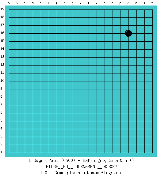 Last move : 1-0 2018 September 20 1:51:34 [Event "FICGS__GO__TOURNAMENT__000022"] [Site "FICGS"] [Date "2018.08.20"] [Round "1"] [Black "O Dwyer,Paul"] [White "Baffoigne,Corentin"] [Result "1-0"] [Rating 1 "0600"] 1.q16 1-0 This go game has been lost on time (started : 2018.08.20 20:18:27) Here are the names of the openings (joseki) played in the four corners : Player Black won this Go (weiqi, baduk) game. Follow this game move after move (download)The weak player fears ko, the strong player seeks it. (Bill Taylor) Programmer - an organism that turns coffee into software. (Anonymous)