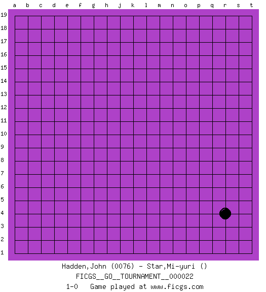 Last move : 1-0 2018 September 20 1:51:34 [Event "FICGS__GO__TOURNAMENT__000022"] [Site "FICGS"] [Date "2018.08.20"] [Round "1"] [Black "Hadden,John"] [White "Star,Mi-yuri"] [Result "1-0"] [Rating 1 "0076"] 1.r4 1-0 This go game has been lost on time (started : 2018.08.20 20:18:27) Here are the names of the openings (joseki) played in the four corners : Corner q4 : r4 1-0 Komoku (Somok, Xiao~mu`) 3-4 Point. The komoku (3-4) point is the traditional corner enclosure move.. Player Black won this Go (weiqi, baduk) game. Follow this game move after move (download)Go is to western chess what philosophy is to double entry accounting. (from Shibumi, by Trevanian) Remember : Your focus determines your reality. (Qui-Gon Jinn in Star Wars ep.1)
