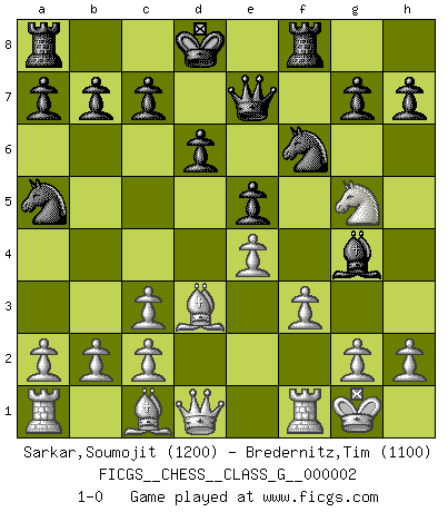 Last move : 1-0 2006 September 4 19:19:38 [Event "FICGS__CHESS__CLASS_G__000002"] [Site "FICGS"] [Date "2006.06.07"] [Round "1"] [White "Sarkar,Soumojit"] [Black "Bredernitz,Tim"] [Result "1-0"] [WhiteElo "1200"] [BlackElo "1100"] 1.e4 e5 2.Nf3 Nc6 3.Bc4 Nf6 4.Nc3 Bb4 5.Ng5 Qe7 6.Bxf7+ Kd8 7.Bc4 Rf8 8.O-O Na5 9.Be2 Bxc3 10.dxc3 d6 11.Bd3 Bg4 12.f3 1-0 Two knights defense Kingside Castling by player White (move 8) Player White won this chess game. Follow this game move after move (download)Good positions don't win games, good moves do. (Gerald Abrahams) Ein guter Spieler hat immer Glück. (José Raúl Capablanca) Cuando le juegas a Fischer, no es una cuestion de si vas a ganar o perder. Es una cuestion de si vas a sobrevivir. (Boris Spassky) Je crois qu'il existe des manières très spécifiques de jouer efficacement contre une machine. Evidemment, nous n'avons aucune chance en technique pure, parce que l'ordinateur calcule de manière parfaite. Mais lorsque nous faisons appel à notre cerveau, en utilisant l'intuition et la compréhension, alors nous restons beaucoup plus forts. (Anatoli Karpov) CHESS, n. f. [echecs, Fr.] A nice and abstruse game, in which two sets of puppets are moved in opposition to each other. (Dr Samuel Johnson, A Dictionary Of The English Language, 1755)