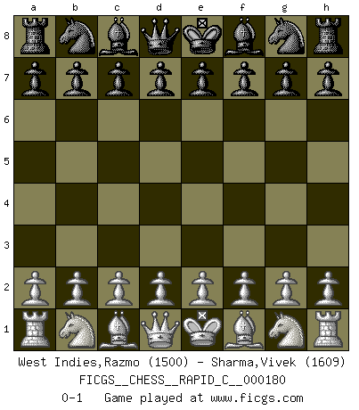 Last move : 0-1 2018 September 20 1:51:34 [Event "FICGS__CHESS__RAPID_C__000180"] [Site "FICGS"] [Date "2018.08.20"] [Round "1"] [White "West Indies,Razmo"] [Black "Sharma,Vivek"] [Result "0-1"] [WhiteElo "1500"] [BlackElo "1609"] 0-1 This chess game has been lost on time (started : 2018.08.20 20:20:35) Player Black won this chess game. Follow this game move after move (download)I am still a victim of Chess. It has all the beauty of art and much more. It cannot be commercialized. Chess is much purer than art in its social position. (Marcel Duchamp) Offensichtlich kennt Kasparow nichts anderes als Schach, und ich könnte 500 weitere Spieler dieser Sorte benennen. (Judith Polgar) Bobby es la celebridad menos entendida y malinterpretada que camina el la faz de esta tierra. (Yasser Seirawan) Mon pion favori sur ma case favorite ! Bronstein en parlant d'un coup de pion en h5 quand il avait les Noirs. God, you are such an idiot. - Actually, I thought I was more of a jerk. (Gregory House to Stacy Warner, House M.D.)