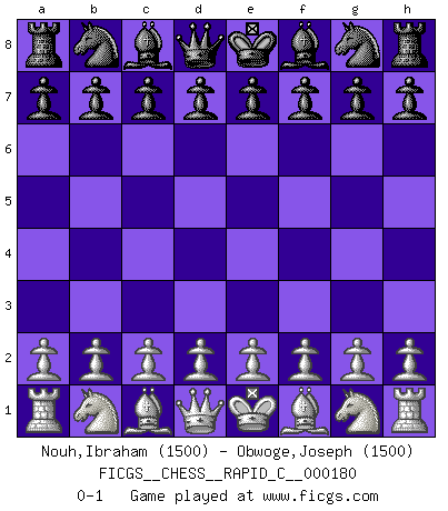 Last move : 0-1 2018 September 20 1:51:34 [Event "FICGS__CHESS__RAPID_C__000180"] [Site "FICGS"] [Date "2018.08.20"] [Round "1"] [White "Nouh,Ibraham"] [Black "Obwoge,Joseph"] [Result "0-1"] [WhiteElo "1500"] [BlackElo "1500"] 0-1 This chess game has been lost on time (started : 2018.08.20 20:20:35) Player Black won this chess game. Follow this game move after move (download)You know, comrade Pachman, I don't enjoy being a Minister, I would rather play Chess like you. (Che Guevara) Als er Schachweltmeister wurde ließ er praktisch alle stärksten Sovietspieler für sich arbeiten. Wenn ein auch nur mittelmässiger Meister ein Spezialist für eine bestimmte Eröffnung war, wurde er von Karpov gerufen. Das wurde alles geheim gehalten. (Mikhail Moiseyevich Botvinik) Cuando tu casa esta en llamas, no puedes ser molestado por tus vecinos. O, como decinos en Ajedrez, si tu Rey esta bajo ataque, no te preocupa perder un Peón del lado de la Reina. (Gary Kasparov) La solitude du joueur d'Echecs à l'approche du mat est semblable à celle du condamné. (Francis Szpiner) Plans are ideas that never come to fruition. (Daniel Parmet)