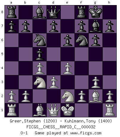 Last move : 0-1 2007 July 2 3:31:52 [Event "FICGS__CHESS__RAPID_C__000032"] [Site "FICGS"] [Date "2007.05.17"] [Round "1"] [White "Greer,Stephen"] [Black "Kuhlmann,Tony"] [Result "0-1"] [WhiteElo "1200"] [BlackElo "1400"] 1.e4 c5 2.c4 Nc6 3.Nc3 Nf6 4.g3 e6 5.Bg2 g6 6.Nge2 Bg7 7.d3 O-O 0-1 This chess game has been lost on time (started : 2007.05.17 20:16:9) Sicilian defense Kingside Castling by player Black (move 7) Player Black won this chess game. Follow this game move after move (download)Fischer is under obligation to nobody. (Joseph Platz) Ich suche im Schach immer etwas Eigenes. Riskantes Spiel im Stile schachlicher Musketiere ist nicht meine Sache, auch wenn es vielen Freunden scharfer Wendungen gefällt. (Anatoly Karpov) Coloca el contenido de las piezas del Ajedrez en un sombrero, agitalo vigorosamente, arrojalas en un tablero desde una altura de 30 centimetros y así obtendras el estilo de Steinitz. (H. E. Bird) Karpov est une pièce de musée. (Garry Kasparov) A good book on your shelf is a friend that turns its back on you and remains a friend. (Author unknown)