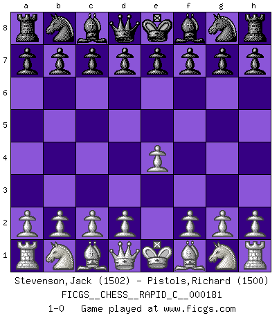 Last move : 1-0 2018 September 25 3:33:19 [Event "FICGS__CHESS__RAPID_C__000181"] [Site "FICGS"] [Date "2018.08.25"] [Round "1"] [White "Stevenson,Jack"] [Black "Pistols,Richard"] [Result "1-0"] [WhiteElo "1502"] [BlackElo "1500"] 1.e4 1-0 This chess game has been lost on time (started : 2018.08.25 19:49:4) King's pawn Opening Player White won this chess game. Follow this game move after move (download)Dazzling combinations are for the many, shifting wood is for the few. (Georg Kieninger) Viele Opfer benötigen überhaupt keine konkrete Berechnung. Es genügt sich die entstehende Position kurz vorzustellen, um uns davon zu überzeugen, dass das Opfer korrekt ist. (Mikhail Nekhemyevich Tal) El Ajedrez es un mar en el cual un mosquito puede beber y un elefante puede bañarse. (Refrán Hindú) Il n'y a pas eu de défaite parce que je ne crois pas que cet ordinateur ait jamais existé. IBM a triché en refusant d'imprimer les modes de recherche de la machine. C'est évident, pendant le match, des coups décisifs ont été joués par des êtres humains. Aujourd'hui, les meilleurs spécialistes en informatique ne peuvent toujours pas expliquer comment Deep-Blue a pu jouer contre la logique des ordinateurs. IBM a gagné une guerre de communication, mais ils sont incapables de prouver que l'ordinateur a gagné tout seul. (Garry Kasparov) How many people work in NATO Headquarters ? - About half of them. (Dirk Stikker, NATO general secretary)