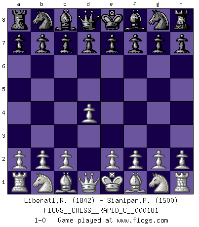 Last move : 1-0 2018 September 25 3:33:19 [Event "FICGS__CHESS__RAPID_C__000181"] [Site "FICGS"] [Date "2018.08.25"] [Round "1"] [White "Liberati,Riccardo"] [Black "Sianipar,Putra"] [Result "1-0"] [WhiteElo "1842"] [BlackElo "1500"] 1.d4 1-0 This chess game has been lost on time (started : 2018.08.25 19:49:4) Queen's pawn Player White won this chess game. Follow this game move after move (download)That's what Chess is all about. One day you give your opponent a lesson, the next day he gives you one. (Bobby Fischer) Schach ist ein schwarz-weisser Dschungel. (Garry Kasparov) El ganador de una partida es aquel jugador que hace el penúltimo error. (Savielly Tartakover) Les ravages du H expliquent la différence de niveau entre Tal et Thal [Abergel]. To send light into the darkness of men's hearts - such is the duty of the artist. (Schumann)