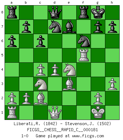 Last move : 1-0 2018 October 21 21:18:28 [Event "FICGS__CHESS__RAPID_C__000181"] [Site "FICGS"] [Date "2018.08.25"] [Round "1"] [White "Liberati,Riccardo"] [Black "Stevenson,Jack"] [Result "1-0"] [WhiteElo "1842"] [BlackElo "1502"] 1.e4 e5 2.Nf3 Nc6 3.Bb5 a6 4.Ba4 Nf6 5.d3 d6 6.c4 Be7 7.h3 O-O 8.Be3 Ne8 9.O-O f5 10.exf5 Bxf5 11.Nc3 Nb8 12.d4 e4 13.Nd2 Nf6 14.Bc2 c6 15.f3 d5 16.fxe4 dxe4 17.Rxf5 Nbd7 18.Ndxe4 1-0 Ruy Lopez : Morphy defense, Duras variation Kingside Castling by player Black (move 7) Kingside Castling by player White (move 9) Player White won this chess game. Follow this game move after move (download)Chess is no whit inferior to the violin, and we have a large number of professional violinists. (Mikhail Botvinnik) Schach verlangt totale Konzentration. (Robert James Fischer) Siempre es mejor sacrificar los hombres de tu oponente. (Savielly Tartakower) Votre seul travail dans les ouvertures est d'obtenir un milieu de partie jouable. (Lajos Portish) A good aphorism is too hard for the tooth of time, and is not worn away with the centuries, although it serves as food for every speech. (Friedrich Nietzsche)
