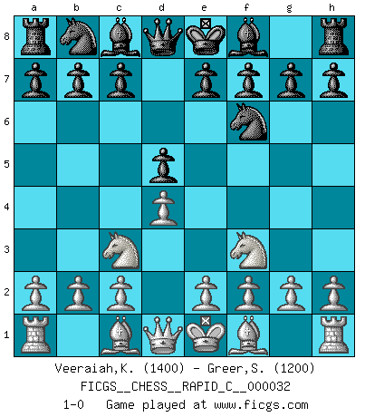 Last move : 1-0 2007 June 24 2:40:25 [Event "FICGS__CHESS__RAPID_C__000032"] [Site "FICGS"] [Date "2007.05.17"] [Round "1"] [White "Veeraiah,Karuppaiah"] [Black "Greer,Stephen"] [Result "1-0"] [WhiteElo "1400"] [BlackElo "1200"] 1.d4 Nf6 2.Nc3 d5 3.Nf3 1-0 This chess game has been lost on time (started : 2007.05.17 20:16:9) Queen's pawn game Player White won this chess game. Follow this game move after move (download)I like the moment when I break a man's ego. (Bobby Fischer) Der Partner hat auch seine Existenzberechtigung. (Savielly Grigorievitsch Tartakower) De eso se trata el Ajedrez. Un día le das una lección a tu oponente y al día siguiente el te da una a tí. (Bobby Fischer) J'apprécie les joueurs d'est-indienne, c'est grâce à eux que je nourris ma famille depuis tant d'années. (Petrosian) First of all, we have to go back to the classical time control. (Anatoly Karpov)