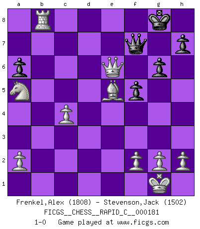 Last move : 1-0 2018 October 11 19:48:8 [Event "FICGS__CHESS__RAPID_C__000181"] [Site "FICGS"] [Date "2018.08.25"] [Round "1"] [White "Frenkel,Alex"] [Black "Stevenson,Jack"] [Result "1-0"] [WhiteElo "1808"] [BlackElo "1502"] 1.e4 e5 2.Nf3 Nc6 3.Bb5 a6 4.Ba4 Nf6 5.O-O Nxe4 6.d4 b5 7.d5 bxa4 8.dxc6 d6 9.Re1 f5 10.Nbd2 Nxd2 11.Nxd2 Be7 12.c4 a3 13.b4 O-O 14.Bxa3 Qe8 15.Nb3 Qxc6 16.Na5 Qd7 17.Qd5+ Kh8 18.Qxa8 Qa4 19.Re3 Qc2 20.Qb8 c5 21.bxc5 Qd2 22.cxd6 Bxd6 23.Bxd6 Rd8 24.Rxe5 g6 25.Rd5 Qg5 26.Be5+ Kg8 27.Qc7 Rd7 28.Rxd7 Bxd7 29.Qxd7 Qh6 30.Rb1 Qf8 31.Qe6+ Qf7 32.Rb8+ 1-0 Ruy Lopez : Open, Richter variation Kingside Castling by player White (move 5) Kingside Castling by player Black (move 13) Player White won this chess game. Follow this game move after move (download)Who is your opponent tonight, tonight I am playing against the Black pieces. (Akiba Rubinstein) Jeder weiß, dass Gasprom Putins persönliches Machtinstrument ist. Die Firma wird vom Kreml aus geleitet und wird schon deshalb nie transparent sein. (Garry Kasparov) Mi estilo es algo parecido entre un poco de Tal y Petrosian. (Reshevsky) Je menace de comprendre la position. (Anonyme) Excelling at chess has long been considered a symbol of more general intelligence. That is an incorrect assumption in my view, as pleasant as it might be. But for the purposes of argument and investigation, chess is, in Russkin-Gutman's words, 'an unparalleled laboratory, since both the learning process and the degree of ability obtained can be objectified and quantified, providing an excellent comparative framework on which to use rigorous analytical techniques.' (The Chess Master and the Computer, by Garry Kasparov - 2010)