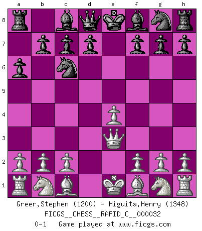 Last move : 0-1 2007 June 27 2:59:3 [Event "FICGS__CHESS__RAPID_C__000032"] [Site "FICGS"] [Date "2007.05.17"] [Round "1"] [White "Greer,Stephen"] [Black "Higuita,Henry"] [Result "0-1"] [WhiteElo "1200"] [BlackElo "1348"] 1.e4 e5 2.d4 exd4 3.Qxd4 Nc6 4.Qe3 a6 0-1 This chess game has been lost on time (started : 2007.05.17 20:16:9) Centre game : Paulsen attack Player Black won this chess game. Follow this game move after move (download)What is the difference between chess and football? Everybody understands football, but nobody plays it. Everybody plays chess, but nobody understands it. Everything is relative. (Vladimir Kramnik) Weshalb minderdergeübte Spieler mit g2-g4 beginnen? Die betreffenden sind unschlüssig, ob sie nun rechts (h4) oder links (f4) beginnen sollen, und in ihrer Ratlosigkeit entschliessen sie sich nach guter Bürgerart dazu, den goldenen Mittelweg zu wählen. (Aaron Nimzowitsch) Yo he agregado estos principios a la ley: pongan los Caballos en acción antes de que los dos Alfiles sean desarrollados. (Emanuel Lasker) Aidez vos pièces, elles vous aideront. (Paul Morphy) There are three kinds of lies: lies, damned lies and statistics. (Mark Twain)