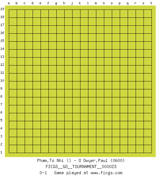 Last move : 0-1 2018 September 29 16:35:10 [Event "FICGS__GO__TOURNAMENT__000023"] [Site "FICGS"] [Date "2018.08.30"] [Round "1"] [Black "Pham,To Nhi"] [White "O Dwyer,Paul"] [Result "0-1"] [Rating 2 "0600"] 0-1 This go game has been lost on time (started : 2018.08.30 15:34:46) Here are the names of the openings (joseki) played in the four corners : Player White won this Go (weiqi, baduk) game. Follow this game move after move (download)Beginner's games are surprising, often incoherent and incomprehensible. When you improve, your game gains in consistency but flirts with stupidity: you become satisfied with truisms and mechanical movements, you try to obtain a feeling for clearness and style the easy way. (Pierre Audouard) Lottery : A tax on people who are bad at math. (Author unknown)