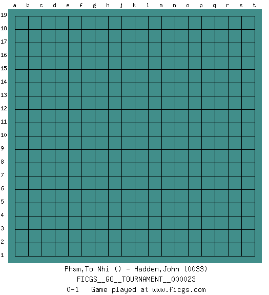 Last move : 0-1 2018 September 29 16:35:10 [Event "FICGS__GO__TOURNAMENT__000023"] [Site "FICGS"] [Date "2018.08.30"] [Round "1"] [Black "Pham,To Nhi"] [White "Hadden,John"] [Result "0-1"] [Rating 2 "0033"] 0-1 This go game has been lost on time (started : 2018.08.30 15:34:46) Here are the names of the openings (joseki) played in the four corners : Player White won this Go (weiqi, baduk) game. Follow this game move after move (download)There are possible things, impossible things, and things that happen. Sometimes things happen that were impossible. (Pierre Audouard) Pretend inferiority and encourage his arrogance. (Sun Tzu)