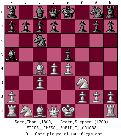Last move : 1-0 2007 June 24 2:40:25 [Event "FICGS__CHESS__RAPID_C__000032"] [Site "FICGS"] [Date "2007.05.17"] [Round "1"] [White "Serd,Than"] [Black "Greer,Stephen"] [Result "1-0"] [WhiteElo "1300"] [BlackElo "1200"] 1.e4 e5 2.Nf3 Nc6 3.Bc4 Bc5 4.b4 Bxb4 5.c3 Ba5 6.d4 1-0 This chess game has been lost on time (started : 2007.05.17 20:16:9) Evans gambit Player White won this chess game. Follow this game move after move (download)Chess holds its master in its own bonds, shackling the mind and brain so that the inner freedom of the very strongest must suffer. (Albert Einstein) Kleine Schachspieler machen Mist, und große Schachspieler machen Mist, aber große machen weniger Mist. (Fritz Sämisch) Preferería tener un Peón que un dedo. (Reuben Fine) Vous n'êtes pas toujours obligé de jouer le meilleur coup. Un coup doit être actif, entreprenant, correct et beau ! (David Bronstein) If you know the enemy and know yourself you need not fear the results of a hundred battles. (Sun Tzu)