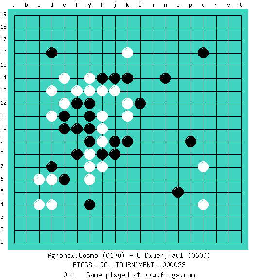 Last move : 0-1 2018 September 12 17:51:36 [Event "FICGS__GO__TOURNAMENT__000023"] [Site "FICGS"] [Date "2018.08.30"] [Round "1"] [Black "Agronow,Cosmo"] [White "O Dwyer,Paul"] [Result "0-1"] [Rating 1 "0170"] [Rating 2 "0600"] 1.d16 q4 2.q16 d4 3.e6 c4 4.g4 d6 5.d7 c6 6.o5 q7 7.p9 k16 8.k14 k12 9.n14 h13 10.l12 k11 11.k9 h11 12.f10 h9 13.h8 f11 14.e13 d11 15.e11 e12 16.e10 d13 17.h14 g14 18.j14 j13 19.f12 f13 20.g11 e14 21.g9 g8 22.j9 h10 23.g12 g13 24.g10 h7 25.j8 g6 26.f8 g7 0-1 Here are the names of the openings (joseki) played in the four corners : Corner d4 : d4 e6 Hoshi (Hwajeom, Seongjeom, Xingwei`) 4-4 Point. The star or hoshi (4-4) point, emphasizing influence at the potential expense of territory. Corner q4 : q4 o5 Hoshi (Hwajeom, Seongjeom, Xingwei`) 4-4 Point. The star or hoshi (4-4) point, emphasizing influence at the potential expense of territory. Corner d16 : d16 h13 Hoshi (Hwajeom, Seongjeom, Xingwei`) 4-4 Point. The star or hoshi (4-4) point, emphasizing influence at the potential expense of territory. Player White won this Go (weiqi, baduk) game. Follow this game move after move (download)A basic: Don't push too hard. (Jansteen) Think like a man of action, act like a man of thought. (Henri Louis Bergson)