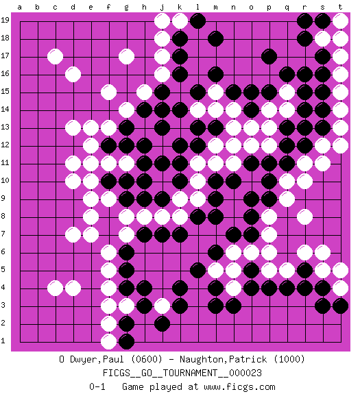 Last move : 0-1 2018 October 7 7:13:8 [Event "FICGS__GO__TOURNAMENT__000023"] [Site "FICGS"] [Date "2018.08.30"] [Round "1"] [Black "O Dwyer,Paul"] [White "Naughton,Patrick"] [Result "0-1"] [Rating 1 "0600"] [Rating 2 "1000"] 1.r16 d16 2.p17 d4 3.q4 g17 4.k10 d10 5.k4 r10 6.q12 r6 7.s4 o6 8.o4 g3 9.k16 d13 10.p10 q9 11.o9 c4 12.g5 d7 13.m6 g14 14.j14 s12 15.r14 g11 16.g9 j12 17.k12 j3 18.k3 f4 19.h4 f5 20.g6 f6 21.h3 g7 22.h7 n5 23.m3 m5 24.l5 h8 25.f7 g8 26.h10 j8 27.j7 k8 28.j2 l10 29.j11 l11 30.k11 l9 31.j13 m12 32.l13 n13 33.n15 p14 34.o14 o13 35.p15 q14 36.r13 p12 37.p11 p8 38.m8 n11 39.l8 k9 40.f8 f9 41.k7 j17 42.k17 j18 43.k18 c17 44.f10 e9 45.f12 e13 46.g12 e12 47.e11 d11 48.h9 f11 49.h12 p5 50.p4 q5 51.r5 s5 52.r4 s6 53.o7 p7 54.o8 h15 55.j15 j16 56.g10 e10 57.h11 n14 58.o15 m14 59.l15 m15 60.m16 q15 61.q16 t15 62.s13 t13 63.r12 s11 64.r15 p13 65.n10 t17 66.s17 s18 67.s16 t16 68.r18 t18 69.s19 r11 70.q11 e11 71.o11 o12 72.s14 t14 73.p9 r8 74.l12 e7 75.g2 f2 76.g4 f3 77.g1 f1 78.m13 m11 79.m9 e8 80.o5 n6 81.n7 n4 82.n3 f13 83.g13 f15 84.h14 l14 85.k14 n12 86.m4 p6 87.j9 k19 88.l19 j19 89.m18 t4 90.t3 t5 91.s3 t19 92.r19 q10 93.s15 t12 94.m10 pass 95.pass pass 96.q13 pass 97.pass pass 98.pass pass 0-1 Here are the names of the openings (joseki) played in the four corners : Corner q4 : q4 r6 Hoshi (Hwajeom, Seongjeom, Xingwei`) 4-4 Point. The star or hoshi (4-4) point, emphasizing influence at the potential expense of territory. Ikken Kakari (Hankan Keolch'im, Yi Gua`jiao~, 1-Space Low Approach). White 2 is the standard approach move to the 4-4. Player White won this Go (weiqi, baduk) game. Follow this game move after move (download)You can hide nothing on the goban. (Pierre Audouard) Memory is a way of holding onto the things you love, the things you are, the things you never want to lose. (from the television show: The Wonder Years)