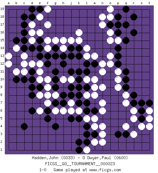 Last move : 1-0 2018 December 30 15:44:7 [Event "FICGS__GO__TOURNAMENT__000023"] [Site "FICGS"] [Date "2018.08.30"] [Round "1"] [Black "Hadden,John"] [White "O Dwyer,Paul"] [Result "1-0"] [Rating 1 "0033"] [Rating 2 "0600"] 1.c4 q4 2.r16 p17 3.q17 d16 4.c16 d17 5.c17 k16 6.q10 p15 7.q15 q7 8.l4 n3 9.m3 n4 10.d10 d15 11.c15 q18 12.r18 o18 13.r7 r6 14.r8 n7 15.l9 n9 16.l7 n11 17.l12 m13 18.k14 l14 19.d14 g15 20.g14 k15 21.j14 e6 22.d6 g6 23.g4 e8 24.d8 f10 25.h8 l5 26.k5 m5 27.l6 j7 28.h7 h6 29.j8 k6 30.k7 j6 31.j5 l10 32.k10 k11 33.l11 m10 34.j11 k12 35.k13 j12 36.h12 j10 37.j13 k9 38.k11 l8 39.k8 m9 40.j9 h10 41.l9 e12 42.k9 g8 43.g7 f7 44.g9 f9 45.g10 f8 46.g11 e11 47.d11 d12 48.e14 c11 49.c10 b11 50.b10 c13 51.b12 c12 52.b13 b14 53.c14 a13 54.e9 e10 55.d9 m4 56.l3 m8 57.d18 e18 58.c18 f17 59.b15 a12 60.f12 f14 61.f13 f15 62.e13 h14 63.g13 j15 64.p13 o13 65.p14 p11 66.q11 p9 67.q9 q8 68.q3 r3 69.p3 m2 70.l2 n2 71.s6 r5 72.s5 s4 73.m6 n6 74.p12 o12 75.p16 o15 76.o17 n17 77.p18 o16 78.p17 n18 79.q19 t5 80.s7 t6 81.t7 t4 82.f5 l13 83.m12 n12 84.e19 f19 85.d19 o19 86.h13 h15 87.e15 e16 88.f6 l1 89.k2 p10 90.k1 1-0 Here are the names of the openings (joseki) played in the four corners : Corner q16 : r16 p17 Komoku (Somok, Xiao~mu`) 3-4 Point. The komoku (3-4) point is the traditional corner enclosure move.. Ikken Kakari (Hankan Keolch'im, Yi Gua`jiao~, 1-Space Low Pincer). The small knight move is the basic approach move to the 3-4 point stone. It has been continually used for over four centuries. There are limitless variations, with new moves constantly being discovered. White 2 opens the door to a treaure store of joseki. Corner d16 : d16 c16 Hoshi (Hwajeom, Seongjeom, Xingwei`) 4-4 Point. The star or hoshi (4-4) point, emphasizing influence at the potential expense of territory. Corner d4 : c4 e6 Komoku (Somok, Xiao~mu`) 3-4 Point. The komoku (3-4) point is the traditional corner enclosure move.. Player Black won this Go (weiqi, baduk) game. Follow this game move after move (download)Learn the eye-stealing tesuji. (Anonymous) You think that education is too expensive ? Try ignorance. (Derek Bok)