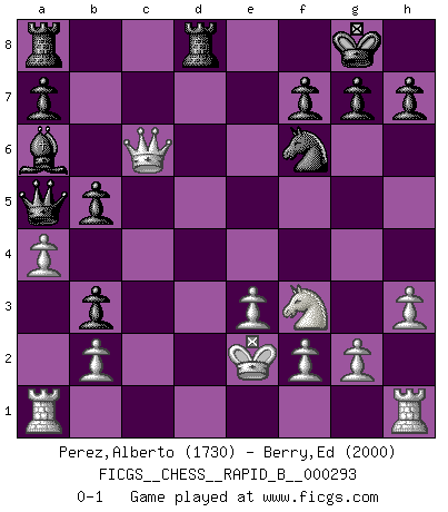 Last move : 0-1 2018 September 27 1:40:10 [Event "FICGS__CHESS__RAPID_B__000293"] [Site "FICGS"] [Date "2018.08.30"] [Round "1"] [White "Perez,Alberto"] [Black "Berry,Ed"] [Result "0-1"] [WhiteElo "1730"] [BlackElo "2000"] 1.d4 Nf6 2.Nf3 e6 3.h3 d5 4.Bf4 Bd6 5.Bxd6 Qxd6 6.c3 O-O 7.e3 c5 8.Nbd2 Nbd7 9.Bd3 e5 10.dxe5 Nxe5 11.Nxe5 Qxe5 12.Nf3 Qc7 13.c4 dxc4 14.Bxc4 b5 15.Bb3 Rd8 16.Qc2 c4 17.a4 Qa5+ 18.Ke2 cxb3 19.Qc6 Ba6 0-1 Queen's pawn game Kingside Castling by player Black (move 6) Player Black won this chess game. Follow this game move after move (download)A Chess game is a dialogue, a conversation between a player and his opponent. Each move by the opponent may contain threats or be a blunder, but a player cannot defend against threats or take advantage of blunders if he does not first ask himself: What is my opponent planning after each move ? (Bruce A. Moon) Ich bin es gewohnt, das die Jugend mir überhaupt keinen Respekt entgegenbringt. (Alexander Morozewich) Yo no creo en la psicología. Yo creo en las buenas movidas. (Bobby Fischer) Echiquier : carré parfait, comme la Jérusalem nouvelle décrite par l'auteur de l'Apocalypse, huit cases sur huit, exaltation du chiffre 4, symbole du cosmos aux quatre horizons... où le noir et le blanc, l'ombre et la lumière, le mal et le bien s'entremêlent et se conjuguent. (Robert Couffignal, Le Gambit du poète) 'preceded by its own quotation yields a falsehood' preceded by its own quotation yields a falsehood. (W. V. O. Quine - Set Theory And Its Logic, 1953)