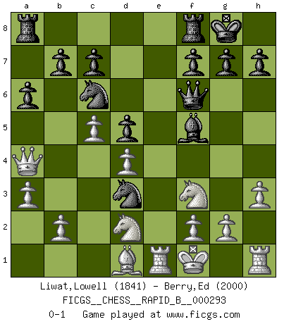 Last move : 0-1 2018 September 3 16:34:14 [Event "FICGS__CHESS__RAPID_B__000293"] [Site "FICGS"] [Date "2018.08.30"] [Round "1"] [White "Liwat,Lowell"] [Black "Berry,Ed"] [Result "0-1"] [WhiteElo "1841"] [BlackElo "2000"] 1.d4 Nf6 2.c4 e5 3.e3 exd4 4.exd4 Bb4+ 5.Bd2 Qe7+ 6.Be2 O-O 7.a3 Bxd2+ 8.Nxd2 d5 9.Kf1 Nc6 10.Ngf3 Bf5 11.c5 a6 12.Qa4 Nh5 13.Re1 Nf4 14.Bd1 Qf6 15.h3 Nd3 0-1 Budapest defense declined Kingside Castling by player Black (move 6) Player Black won this chess game. Follow this game move after move (download)If one piece is badly posted, the whole game is bad. (Tarrasch) Sie bekommen vielleicht den Eindruck, dass die Spitzenspieler überhaupt gar nicht so stark sind. Aber das stimmt nicht. Es ist eine Illusion. Mit einem Computer an der Seite ist es sehr leicht, Urteile zu fällen, aber wenn man alleine am Brett sitzt, sieht die Sache ganz anders aus. (Vladimir Kramnik) Debió haber existido una vez en que los hombres eran semidióses, de otra manera no hubiesen podido inventar el Ajedrez. (Gustav Schenk) Les Echecs sont et restent toujours un combat, un combat intégral comme la boxe, la lutte ou un autre sport, et où il doit y avoir un vainqueur et un vaincu. (Joseph Emil Diemer) Empty your mind, be formless, shapeless — like water. (Bruce Lee)
