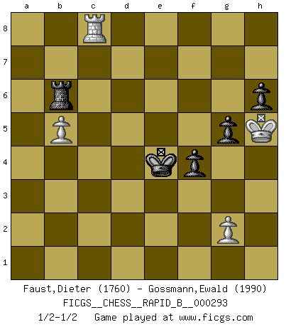 Last move : 1/2-1/2 2018 December 12 20:26:7 [Event "FICGS__CHESS__RAPID_B__000293"] [Site "FICGS"] [Date "2018.08.30"] [Round "1"] [White "Faust,Dieter"] [Black "Gossmann,Ewald"] [Result "1/2-1/2"] [WhiteElo "1760"] [BlackElo "1990"] 1.e4 c6 2.d4 d5 3.Nc3 dxe4 4.Nxe4 Nf6 5.Nxf6+ exf6 6.c3 Bd6 7.Bd3 O-O 8.Ne2 Re8 9.O-O Na6 10.Bf4 Nc7 11.Qd2 Nd5 12.Bg3 f5 13.Rfe1 Be6 14.a3 Bxg3 15.hxg3 Qd6 16.c4 Nf6 17.b4 Rad8 18.Rad1 h6 19.d5 cxd5 20.c5 Qe7 21.Bb5 Bd7 22.Nd4 Ne4 23.Qd3 Qg5 24.Bxd7 Rxd7 25.f3 Red8 26.c6 bxc6 27.Nxc6 Rc8 28.fxe4 Rxc6 29.Qb5 Rc2 30.Qxd7 Qxg3 31.Re2 Rxe2 32.Qc8+ Kh7 33.Qxf5+ Qg6 34.Qxg6+ Kxg6 35.exd5 Re7 36.Kf2 Kf5 37.Rc1 Rd7 38.Ke3 Ke5 39.Rc5 f5 40.a4 f4+ 41.Kf3 g5 42.b5 Rd6 43.Kg4 a6 44.Kh5 Kd4 45.Rc6 Kxd5 46.Rc2 Re6 47.Rc1 Rb6 48.Rc2 axb5 49.axb5 Ke4 50.Rc5 Rd6 51.Rc2 Kd5 52.Rc1 Rb6 53.Rc8 Ke5 54.Rc5+ Ke4 55.Kg4 Rd6 56.Kh5 Rb6 57.Kg4 Rd6 58.Kh5 Kd4 59.Rc6 Kd5 60.Rc3 Rb6 61.Rc8 Ke4 1/2-1/2 Caro-Kann : Tartakower (Nimzovich) variation Kingside Castling by player Black (move 7) Kingside Castling by player White (move 9) 10 pieces endgame at move 48 : White KRPP , Black KRPPPP WHITE : King + 1 Rook 2 Pawns BLACK : King + 1 Rook 4 Pawns 9 pieces endgame at move 49 : White KRPP , Black KRPPP WHITE : King + 1 Rook 2 Pawns BLACK : King + 1 Rook 3 Pawns This chess game ended in a draw. Follow this game move after move (download)Could we look into the head of a Chess player, we should see there a whole world of feelings, images, ideas, emotion and passion. (Alfred Binet) Es hat in meinem Leben Zeiten gegeben, in denen das Schachspiel, wenn nicht zum Lebenszweck, so doch zu einem regelrechten Lebensersatz geworden ist. Man fühlt sich in solchen Zeiten nicht so, als besäße man eine göttliche Gabe, sondern eher so, als sei man von ihr besessen. (Garry Kasparov) Yo no creo en la psicología. Yo creo en las buenas movidas. (Bobby Fischer) La victoire dans une partie d'Echecs appartient la plupart du temps à celui qui voit un peu plus loin que l'adversaire. (Lasker) Always two there are. No more no less. A master, and an apprentice. (Master Yoda in Star Wars ep.1)