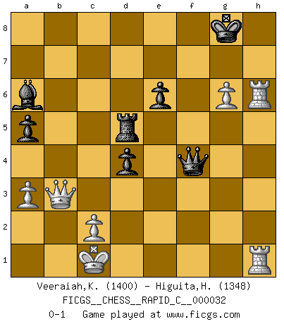 Last move : 0-1 2007 September 4 19:7:57 [Event "FICGS__CHESS__RAPID_C__000032"] [Site "FICGS"] [Date "2007.05.17"] [Round "1"] [White "Veeraiah,Karuppaiah"] [Black "Higuita,Henry"] [Result "0-1"] [WhiteElo "1400"] [BlackElo "1348"] 1.d4 d5 2.Nc3 e6 3.e4 Bb4 4.e5 a6 5.Bd2 Nc6 6.Nf3 h6 7.a3 Bxc3 8.Bxc3 Nge7 9.g3 O-O 10.Bg2 Ng6 11.Qd2 f6 12.O-O-O fxe5 13.Nxe5 Ncxe5 14.dxe5 c5 15.f4 Rb8 16.Qd3 Ne7 17.h4 Nf5 18.Be4 b5 19.Bxf5 Rxf5 20.Rdf1 b4 21.g4 Rf7 22.Bd2 c4 23.Qg6 bxa3 24.bxa3 d4 25.g5 h5 26.Qxh5 Rf5 27.Bb4 a5 28.Bd6 Rb7 29.Qe2 Rbf7 30.g6 Rd7 31.Qxc4 Rxd6 32.exd6 Rd5 33.h5 Bb7 34.h6 gxh6 35.Rxh6 Qxd6 36.Qb3 Ba6 37.Rfh1 Qxf4+ 0-1 This chess game has been lost on time (started : 2007.05.17 20:16:9) Queen's pawn : Chigorin variation Kingside Castling by player Black (move 9) Queenside Castling by player White (move 12) Player Black won this chess game. Follow this game move after move (download)Best by test: 1. e4 (Bobby Fischer) Was ist der Unterschied zwischen einem Strassenarbeiter und einem Schachspieler? --Der Schachspieler bewegt sich ab und zu. (Anonymous) Todos los Maestros de Ajedrez fueron un día unos principiantes. (Chernev) Il a essayé de se convaincre qu'il pourrait empêcher toutes les erreurs et ne jamais perdre. L'horreur ! Gary Kasparov au sujet de Robert Fischer. Every vice is only an exaggeration of a necessary and virtuous function. (Ralph Waldo Emerson, Journals 1936)