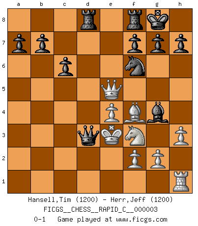 Last move : 0-1 2006 August 2 23:27:25 [Event "FICGS__CHESS__RAPID_C__000003"] [Site "FICGS"] [Date "2006.06.08"] [Round "1"] [White "Hansell,Tim"] [Black "Herr,Jeff"] [Result "0-1"] [WhiteElo "1200"] [BlackElo "1200"] 1.e4 e5 2.d3 d5 3.Nc3 d4 4.Nb5 c6 5.Na3 Nf6 6.Nf3 Bxa3 7.bxa3 Nbd7 8.c3 dxc3 9.d4 exd4 10.Qxd4 Qa5 11.Bc4 c2 12.Bd2 Qxa3 13.Rc1 O-O 14.Rxc2 Nb6 15.Bc1 Qa5+ 16.Ke2 Bg4 17.Bf4 Rad8 18.Qe5 Nxc4 19.Rxc4 Qxa2+ 20.Ke3 Qxc4 21.h3 Qd3+ 0-1 Variation Indian Opening : Indian Opening Kingside Castling by player Black (move 13) Player Black won this chess game. Follow this game move after move (download)The tactician must know what to do whenever something needs doing; the strategist must know what to do when nothing needs doing. (Savielly Tartakover) Oft bringt ein stiller Zug das Erdbeben. (Richard Reti) Todo se encuentra en un estado de flujo y esto incluye al mundo del Ajedrez. (Mikhail Botvinnik) Soyez une menace à chaque fois que vous vous asseyez pour jouer. (Ken Smith) Chess, like love, like music, has the power to make people happy. (Siegbert Tarrasch)