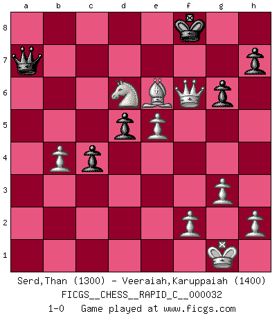 Last move : 1-0 2007 June 23 10:46:55 [Event "FICGS__CHESS__RAPID_C__000032"] [Site "FICGS"] [Date "2007.05.17"] [Round "1"] [White "Serd,Than"] [Black "Veeraiah,Karuppaiah"] [Result "1-0"] [WhiteElo "1300"] [BlackElo "1400"] 1.e4 c5 2.Nf3 d5 3.e5 a6 4.d4 e6 5.c3 c4 6.b4 b5 7.a4 g6 8.axb5 Bd7 9.bxa6 Nxa6 10.g3 Nc7 11.Rxa8 Qxa8 12.Bg2 Ba4 13.Qe2 Nb5 14.Bd2 Bc2 15.O-O Bd3 16.Qd1 Bxf1 17.Bxf1 Bh6 18.Ng5 Qa1 19.Nxf7 Bxd2 20.Nxh8 Bxc3 21.Nxc3 Qxc3 22.Qa4 Qxd4 23.Qxb5+ Kf8 24.Qd7 Nh6 25.Qd8+ Kg7 26.Qf6+ Kg8 27.Bh3 Qa7 28.Bxe6+ Nf7 29.Nxf7 Kf8 30.Nd6 1-0 Comment by player 1 : Than Serd : fantastic game Sicilian defense Kingside Castling by player White (move 15) Player White won this chess game. Follow this game move after move (download)The mistakes are there, waiting to be made. (Savielly Tartakower) Frage des Reporters: -Welche besonderen Umstände rechtfertigen das Anhalten der Uhren während einer Turnierpartie? Antwort: -Einen Fotographen zu strangulieren. (Siegbert Tarrasch) Un Peón pasado aumenta su poder a medida de que el número de piezas en el tablero disminuye. (Capablanca) Karpov est une pièce de musée. (Garry Kasparov) A good player is always lucky. (Capablanca)