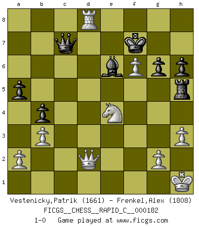 Last move : 1-0 2018 September 15 1:2:14 [Event "FICGS__CHESS__RAPID_C__000182"] [Site "FICGS"] [Date "2018.08.31"] [Round "1"] [White "Vestenicky,Patrik"] [Black "Frenkel,Alex"] [Result "1-0"] [WhiteElo "1661"] [BlackElo "1808"] 1.e4 e5 2.Nf3 Nc6 3.Bb5 a6 4.Bxc6 dxc6 5.O-O Bg4 6.h3 Bh5 7.d3 f6 8.Be3 Bd6 9.Nbd2 c5 10.c3 Ne7 11.Qb3 Nc6 12.Nh4 Bf7 13.Nc4 b6 14.Nxd6+ cxd6 15.Qa4 b5 16.Qd1 Qd7 17.d4 exd4 18.cxd4 cxd4 19.Bxd4 O-O 20.Nf5 Be6 21.Ne3 Rfe8 22.Qd3 Rac8 23.Rfd1 Nxd4 24.Qxd4 Rc6 25.b3 Qc7 26.Qb4 Qb6 27.Rd4 a5 28.Qd2 b4 29.Rd1 Qb7 30.Rc1 Rxc1+ 31.Qxc1 Rc8 32.Qd2 Rc3 33.Nf1 Kf7 34.Ng3 Qc7 35.Rxd6 Rc2 36.Qd4 Rc5 37.f4 Rb5 38.Kh2 h6 39.Qd3 Rc5 40.e5 fxe5 41.f5 Bc8 42.f6 g6 43.Qd2 e4 44.Nxe4 Rh5 45.Kh1 Be6 46.Rd8 1-0 Ruy Lopez : Exchange variation, 5.O-O Kingside Castling by player White (move 5) Kingside Castling by player Black (move 19) Player White won this chess game. Follow this game move after move (download)I won't play with you anymore. You have insulted my friend. - When an opponent cursed himself for a blunder. (Miguel Najdorf) Es tut gut, die Entwicklungsperiode von, [...] demokratischem Geist durchdringen zu lassen. Wie undemokratisch wäre es doch beispielsweise, den einen Offizier große Spaziertouren vornehmen zu lassen, während die anderen zu Hause säßen und sich entsetzlich langweilten. (Aaron Nimzowitsch) El Ajedrez es un expediente tonto que hace creer a la gente inactiva que hacen una cosa muy astuta cuando solamente estan perdiendo su tiempo. (George Bernard Shaw) Le moment que je préfère le plus dans une rencontre, c'est celui où je sens que la personnalité de l'adversaire se brise. (Robert Fischer) Follow your passion, and success will follow you. (Arthur Buddhold)