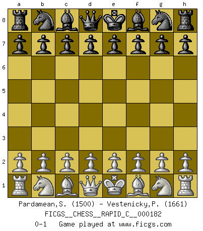Last move : 0-1 2018 September 30 4:34:32 [Event "FICGS__CHESS__RAPID_C__000182"] [Site "FICGS"] [Date "2018.08.31"] [Round "1"] [White "Pardamean,Sianipar"] [Black "Vestenicky,Patrik"] [Result "0-1"] [WhiteElo "1500"] [BlackElo "1661"] 0-1 This chess game has been lost on time (started : 2018.08.31 0:57:6) Player Black won this chess game. Follow this game move after move (download)For me, Chess is life and every game is like a new life. Every Chess player gets to live many lives in one lifetime. (Eduard Gufeld) Das Blackmar-Diemer-Gambit verändert den ganzen Menschen! (Emil Joseph Diemer) Realmente no sabemos como el juego fue inventado, aunque hay sospechas. Tan pronto como descubramos a los culpables, se los haremos saber. (Bruce Pandolfini) Des points faibles ou des trous dans la position de l'adversaire doivent être occupés par des pièces et non pas par des pions. (Siegbert Tarrasch) There are lots of people who mistake their imagination for their memory. (Josh Bilings)
